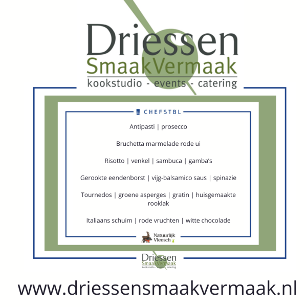 Chef aan huis – Een onvergetelijke culinaire ervaring Beleef een complete avond vol smaak en verwennerij met een chef bij u thuis. Van tafelaankleding tot friandises bij de koffie, alles wordt tot in de puntjes verzorgd. Geniet van een 6-gangenmenu met pure, ambachtelijke ingrediënten. Denk aan antipasti met prosecco, mozzarella burrata met bruschetta, risotto met truffel, gerookte eendenborst, brisket met gegrilde groenten en als afsluiter een warme moelleux au chocolat. De chef voegt een vleugje entertainment toe door te vertellen over de gerechten, de bereiding en de ingrediënten.